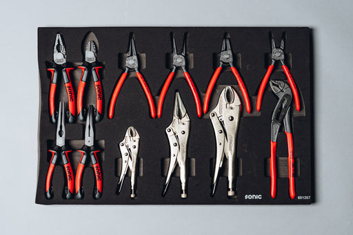 Sonic ToolsExtra long bent and straight long-nose pliers offer reach in areas other tools can’t handle. Two snap-ring pliers provide straight-on options, whil...